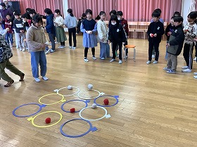 1月30日の木曜日、ほかの学年が体育館を使って学習をするため、体育の学習ができませんでしたが、授業を変更するのではなく、多目的ホールを使ってニュースポーツをしました。